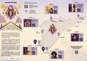 Une carte a été créée pour le projet. Elle reprend le parcours de la balade et des QR codes amenant aux différents épisodes du podcast.